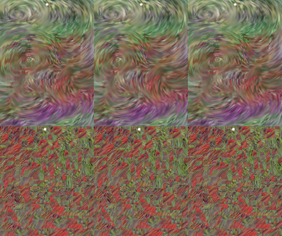 あの、平行法とか交差法とかで見ると立体に見えると言うやつです。 見れない人にはただの模様なので、ごめんなさい。 平行法、交差法どちらでも見れます。 えーと、見る方法は 普通は物を見る時は右目、左目、両方で 同じところを見て距離や形を把握しますが この場合右目と左目とで別々の所を見ます。 平行法の場合は 横に3枚の絵が並んでますが(上下にも2段) 例えば左端の絵の白い点を左目で見て その右隣の点を右目で見ます。 遠くを見るように目の力を抜けばやりやすいかと思います。 横に3つ並んでる絵が4つに見えれば成功で、 その4つの中のまん中2つの絵が 左側は手前に出っ張って見えて 右側は奥に引っ込んで見えるはずです。 う〜ん、字で説明するのは難しいなぁ。