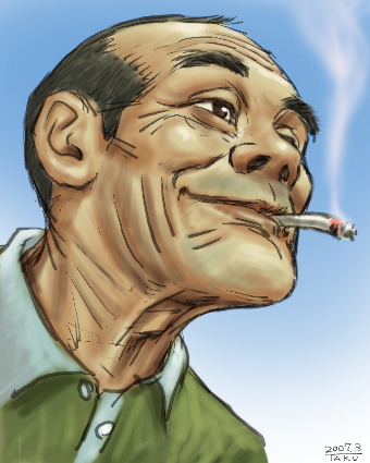 なんつッ亭の黒マー油豚骨ラーメンの話を書きましたが 今日は自分でマー油っぽいものを作ってみました。 過去2回作っていて今日ので3度目になります。 マー油を検索するといろんな作り方があったので 自分で出来る範囲で作りました。 ある所の作り方では、豚の背脂と、サラダ油、ゴマ油に ネギや生姜、ニンニク等を入れて 色がつくまで熱して具を漉して出来上がり という感じなのです。 色のついたニンニクをミキサーで混ぜる、という所もありました。 しかし豚の背脂ってどこで手に入るんだろう? ・・・わからないのでラードでも使おう。 そして今日、なんつッ亭のホームページも少し参考にして 3度目のマー油らしきもの作りました。 今日の作り方。 まず乾燥ニンニクをオリーブオイルとゴマ油(ゴマ油多め)で熱して 色の付き具合別にやや茶色くなったもの〜黒くなったものまで 何段階かの色の濃さのニンニクを作って それをフードプロセッサーとか擂り鉢で粉々にしておきます。 ニンニクを取り去った後の油にラードも加え 今度はタマネギ、ネギ、生姜のみじん切りを入れ 弱火で時間をかけてじっくり熱します。 具に色がついてだいぶ縮んだ頃に火を止めました。 それにさっき粉々にしておいたニンニクを入れて混ぜて 超具沢山の黒い油の完成です。 私はマー油もどきと呼んでます。 冷めたら冷蔵庫で保存。 明日の昼にラーメンに入れて喰ってみよう。 過去2回作ったマー油もどきでは やっぱり味噌ラーメンやとんこつラーメンなど 濃いスープ系のラーメンに合いました。 他にも味噌汁にちょっと入れたり 炒めものや焼肉にもあとから乗せたり いろいろ楽しんで使いました。 さて今回の出来はどんなもんかな。 そして今日の絵は本文とは関係ない爺さんを。 PR