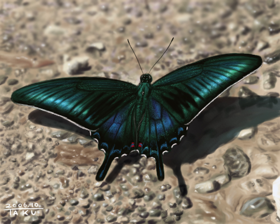 ウチの庭のキハダの木に。 ミヤマカラスアゲハが。 この辺に生息しているアゲハの中で一番好きなアゲハです。 カラスアゲハも綺麗なのですがミヤマカラスアゲハの方が、より綺麗なんです。 ウチの庭にはアゲハ類を呼び寄せる為にセリ科(キアゲハ)とミカン科(その他のアゲハ)の植物が数種類づつあります。 ウチのミカン科の木は、サンショウ、ユズ、コクサギ、キハダ、と4種類ありますが、 ミヤマカラスアゲハの幼虫はこの4種類の中では唯一キハダしか食べないのです。 カラスアゲハは何年も前から来てたのですが、 ミヤマカラスアゲハは去年初めてやってきたのです(幼虫しか見てませんが) キハダの木がやっと大きくなってきたからです。 去年はカラスアゲハとミヤマカラスアゲハの2種類の幼虫を飼育ケースに入れて飼ってました。 しばらくして、お隣さんがアメリカシロヒトリの発生で庭の木に薬を撒いたのです。 しかもサービスでウチの庭にも薬を撒いてくれたのです(涙) カラスアゲハの幼虫は他の場所にあるコクサギの葉っぱを食べて無事だったのですが ミヤマカラスアゲハの幼虫は薬のかかったキハダしか食べるものが無く死んでしまいました。 カラスアゲハの方は今年の春、無事に成虫となって数匹空に飛んでいきました。 さてさて今年はカラスアゲハの幼虫いないなぁ〜、と思っていたら 昨日ミヤマカラスアゲハの幼虫を発見したのです。 今5匹ケースに入れて飼ってます。 来年の春、成虫になるのが楽しみだなぁ。 そこで今日はミヤマカラスアゲハの絵を描きました。 何年も前に山で撮った写真を見ながら。 是非クリックして大きくして見て下さい。 限られた時間で羽の鱗粉も頑張って描いた渾身の一枚です。 ってゆーか地面めんどくせー!! 虫が嫌いな人には結構どうでもいい話でしたね。 PR