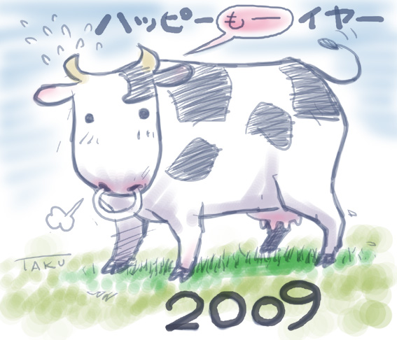 というか 嫁が年賀状用に牛を描くというので、牛って大体こんな感じの体だよ〜 ってササッと描いた見本絵にちょいと手を加え色着けたものでした。 後で年賀状本番用の絵も貼っておこうかな。 今年もよろしくお願いします。