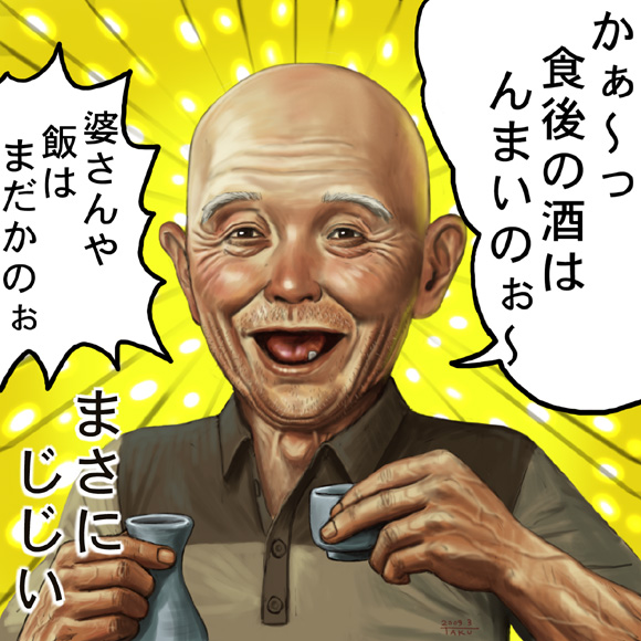 記事を書いた後日、会場に顔を出したら ちょうど地元のラジオ局の人が来て そのまま会場からラジオの生中継しました。 似顔絵の事話したり 似顔絵の描き方についてのクイズを出題したり 10分位の中継でしたが 車で近くを通った人がラジオを聴いてて寄ってくれたりして いい宣伝になりました。ありがたやありがたや。 さあ明日が最終日だ。 話題は変わりますが 先日もにたがネズミ喰ってたそうです。 今年初。 雪も解けたし、もうそんなシーズンなんですねぇ。 そして昨日pixivに投稿したのが この絵。 なんか元は赤ちゃんの画像で「まさに外道」というネタなんですが その赤ちゃんの面影を残しつつ じじいバージョンを描いてみました。 まぁ、元の赤ちゃんの画像も、どこからやってきて なんであんなネタ画像になったのか 詳しい事はよく知らないんですけどね。 PR
