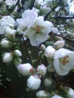 咲き始めた庭のボケの花も