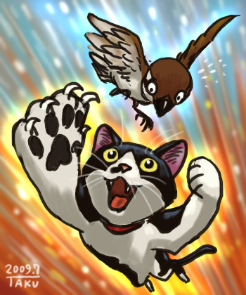 庭からウチの中に入ると ソファーの横にもにたがいたんです。 よくよく見ると もにたの足下には もう動かない雀がいました。 おおおおお、また捕まえて来たか。 雀は2回目だ。 「すごいなぁ、もにた」 立ったまま見下ろしていると もにたは「にゃ〜!にゃ〜!」 と、何か訴えるように鳴くんです。 「何だ?何だ?食べるから傍にいろっていうのか?」 と、ソファーに座ったら安心したかのようにガリゴリ食べはじめました。 頭を食べ終えたところで 2階の自分の部屋に行こうと階段をのぼり始めると もにたは食べるのを止めてジッとこっちを見るんです。 「ええ〜?なんだ?喰い終わるまで傍にいればいいんか?」 もう最後まで見届けましたよ。 何本かの羽根を残し、キレイに完食です。 安心して2階に上がると 廊下と私の部屋に 雀の羽根が。 あああああ〜、もにた・・・ 雀捕ったよー!!って見せにきたのかな。 一所懸命一所懸命頑張って捕ったんだよ!! 見て見てーって2階の部屋に来たら誰もいなくて ちょっとしょんぼりしちゃったのかな。 だから食べる時、傍で見てて って甘えたのかな。 おおおおおおおお 可愛いやつめ!!! と、 自分の都合の良いように解釈すると 猫との生活もとても楽しいですよ。 結構本気でそう解釈してるけど・・・。 しかし雀を捕まえるなんて 猫って大したハンターだね。 PR