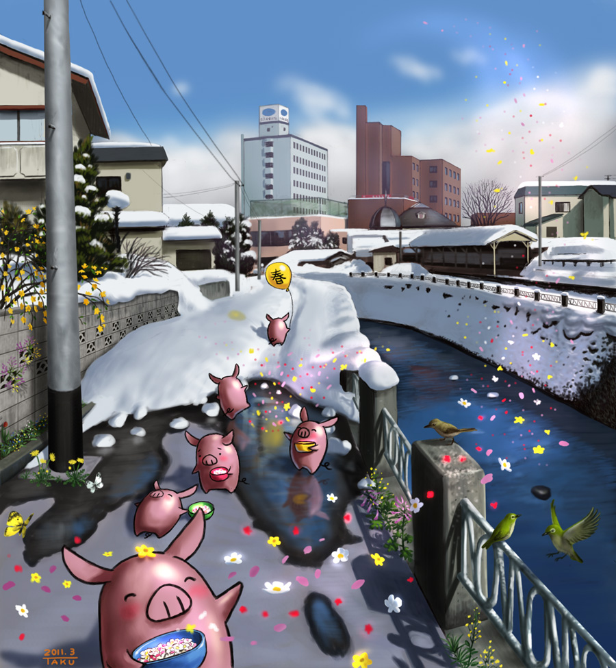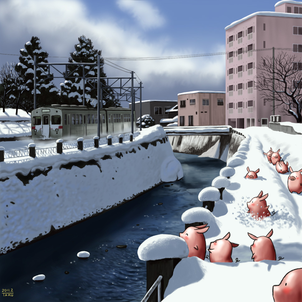 同じく市内の雪景色に春を呼ぶぶた達を描きました。