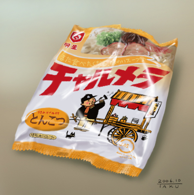 まずはみじん切りのタマネギとにんにく、あとベーコンをフライパンで炒めて タマネギがいい色になった頃に少し醤油系の味付けをして そこに更にキクラゲ入れて、も少し炒めて、それをスープに使うべくお湯に入れてぐつぐつと煮ました。 そして少〜しだけ片栗粉でとろみを付けて粉末スープでラーメンのスープ完成。 ホントはとろみをつけるのが最後なんだけど諸事情により粉末スープが後になりました。 とろみはついてるかついてないか分からないくらいなので大丈夫っぽい。 別のお湯で麺を茹で、少々硬めでお湯を切りスープに入れ ちょっと多めにワカメを乗せてできあがり。 とりあえずうまい。 普段はインスタントラーメンで湯切りはしないんですが 今日はちょっといつもと違った感じにしました。 でも最近はラーメンに炒めたタマネギは定番になってるなぁ。 そこで今日は食べ終った後のチャルメラの袋を見ながら描いてみました。 おじさんの絵は普通に描いた物を後で変型させて張り付けました。 パソコンって便利〜。 PR