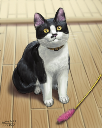 よく一緒に遊ぶのがネズミのおもちゃや猫じゃらし。 ネズミのおもちゃはよくかじってすぐボロボロになってしまいます。 家具や棚などの隙間に入って取れなくなるし。 そこでネズミのおもちゃに凧糸通してネズミを操って遊ばせたりしてます。 ボロボロになるのは変わりませんが。 猫じゃらしは黄色いプラスチックの棒の先にピンクや黄色の軟らかい物体がついてるものです。 それを巧みに操って猫を遊ばせるのです。 もにたは一人でもよく遊びますが、人に遊んでもらうのが好きです。 部屋で仕事とかしていると、階段から「カツン カツン カツン ・・・」と、音がします。 もにたが猫じゃらしをくわえて階段を登ってくるのです。 口にくわえた猫じゃらしのプラスチックの棒が階段の角に「カツン カツン」と当るのです。 そしてもにたは私から1〜2mくらいの所に猫じゃらしを置いて そこにちょこんと座り、じっとこっちを見るのです。 たまに猫じゃらしの方を見て、再びこっちを見るのです。 「これで遊んでよう」 目が訴えてます。 ときには猫じゃらしをチョイチョイと触ってアピールします。 それでも構わないと前脚で私の脚にチョイチョイ触ります。 「遊んでよう」 うおおおおおおおお、かわええ!! 遊ぶよ、遊んでやるよ!! 今日ももにたに負けました。 PR
